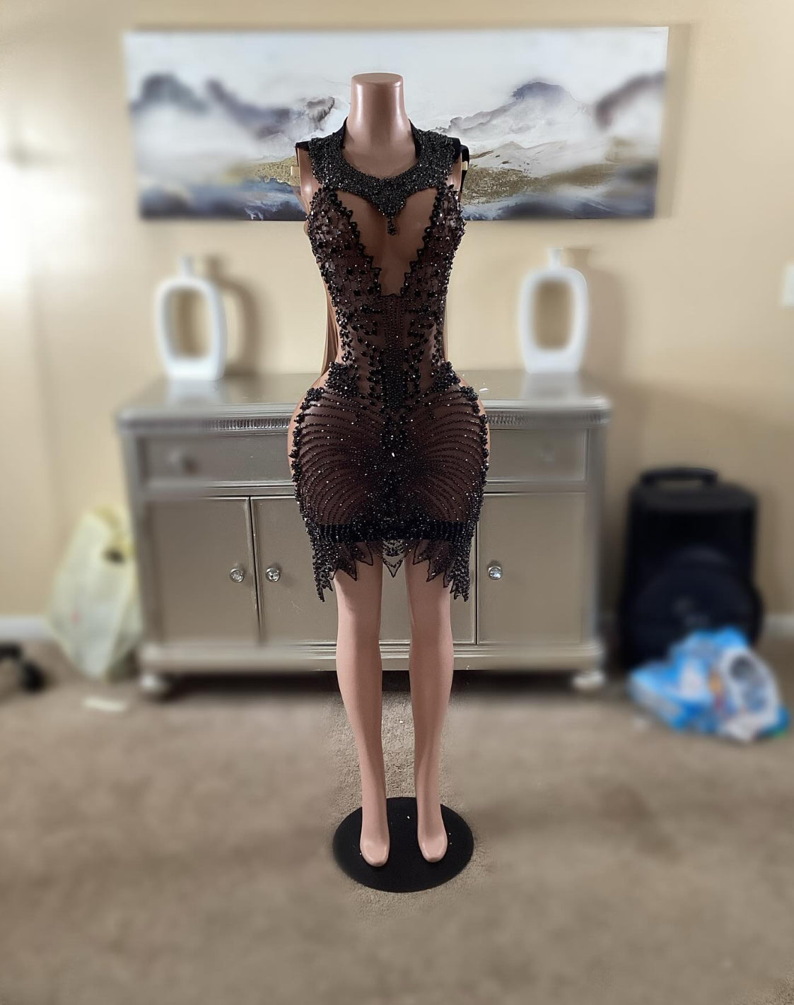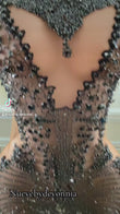 This is a fully beaded and hand sewn mesh front midi dress. This dress has a Lycra backing which gives a little stretching. The back comes in a variety of colors. Sample ready to ship fits size 12/14 without any alterations.
