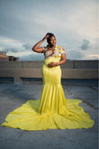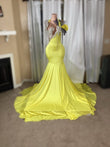 This gown is 100% stretch. The gown fits up to size 12 comfortably without any alterations. It has a mesh top with hand sewn appliqués, hand placed stones and individual hand sewn fringes. There is also a hand sewn fringe appliqué complimenting the shoulder. Feathers are also placed and sewn to complete the gown. This is a sample gown. No alterations will be made by the designer on sample gowns. It is sold as is.