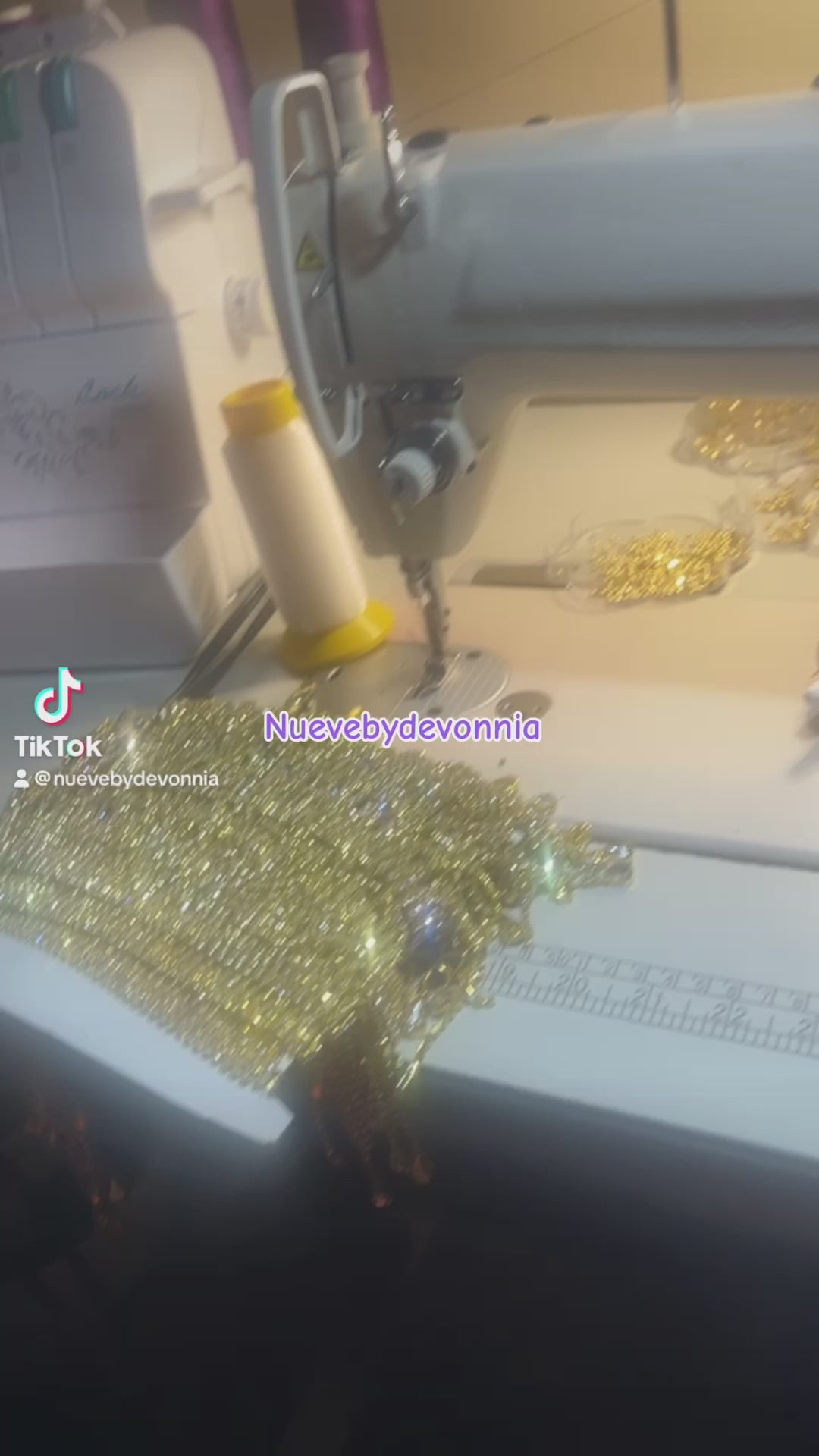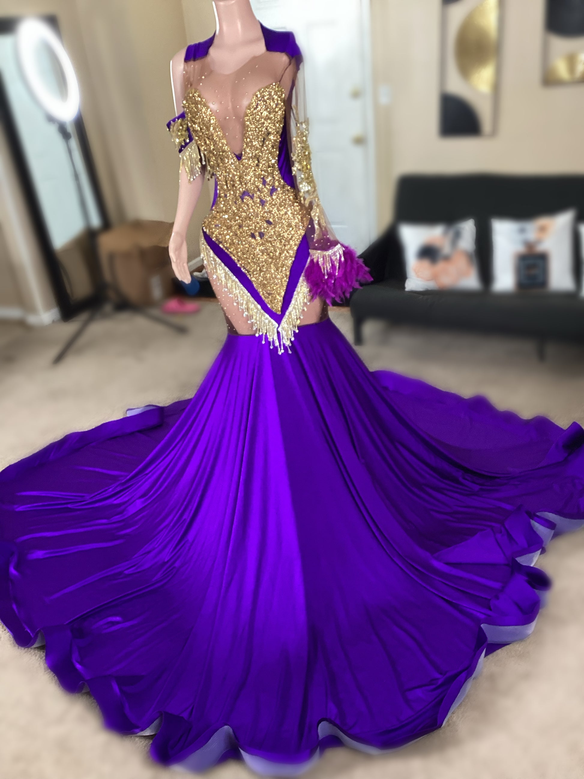 This gown is made of a full beaded and hand sewn bodice mesh thigh cut outs with beaded fringe trim. The is a mesh sleeve with hand sewn appliqués, feathers and beaded fringe trim. There is also an added arm band with beaded fringes and appliqués as well.