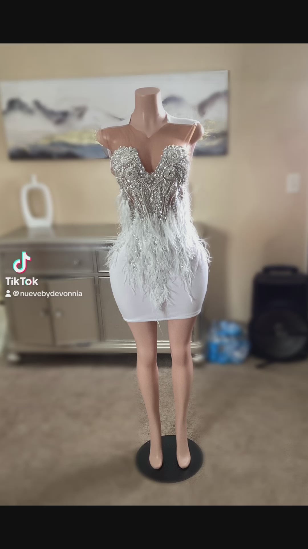 This dress has a hand sewn feather bodice sewn on a mesh top. The back is solid in color. This dress can be made in a variety of colors.